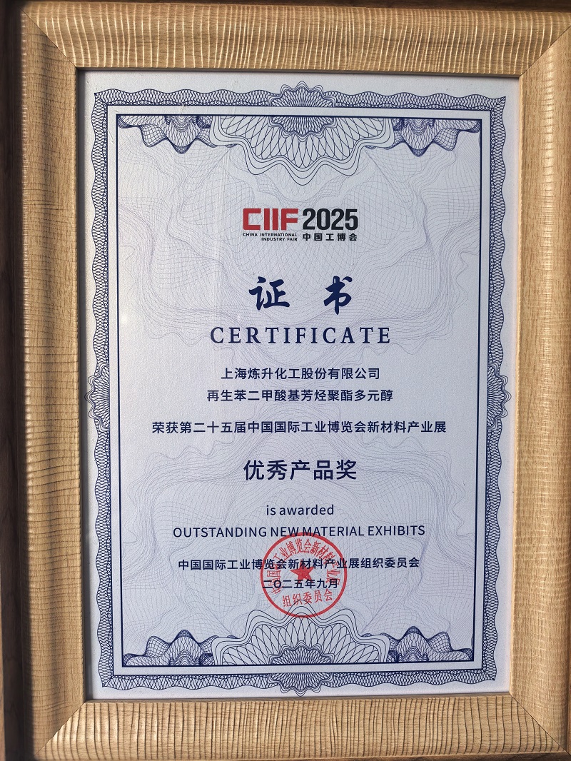2025年9月,在第二十五届中国国际工业博览会新材料产业展上,上海炼升化工股份有限公司凭借再生苯二甲酸基芳烃聚酯多元醇,以突出的技术创新与产品价值,荣获优秀产品奖。